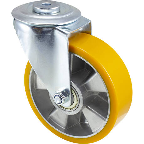 vidlice: ocelový pozinkovaný plech s dvojitým kuličkovým věncem, kolo: hliník s polyuretanovým běhounem Shore A 92 na kuličkovém ložisku