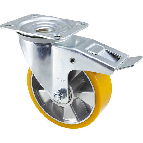 vidlice: ocelový pozinkovaný plech s dvojitým kuličkovým věncem, kolo: hliník s polyuretanovým běhounem Shore A 92 na kuličkovém ložisku