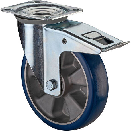 Transportní kolo série B92 s polyuretanovým běhounem v otočné vidlici s brzdoz s uchycením na plotnu na čtyři šrouby