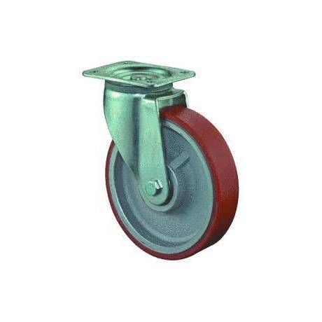 vidlice: ocelový pozinkovaný plech s dvojitým kuličkovým věncem, kolo: litinové s polyuretanovým běhounem Shore A 92 na kuličkovém ložisku