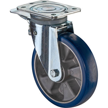 Transportní kolo série B92 s polyuretanovým běhounem v otočné vidlici pro vysoké zatížení s brzdou s uchycením na plotnu na čtyři šrouby