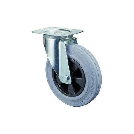 vidlice: ocelový pozinkovaný plech s dvojitým kuličkovým věncem, kolo: plastové s šedou nešpinící gumou na jehlovém ložisku