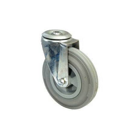 vidlice: ocelový pozinkovaný plech s dvojitým kuličkovým věncem, kolo: plastové s šedou nešpinící gumou na jehlovém ložisku