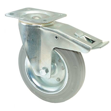 vidlice: ocelový pozinkovaný plech s dvojitým kuličkovým věncem, kolo: plechové s šedou nešpinící gumou na jehlovém ložisku
