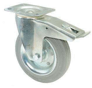 vidlice: ocelový pozinkovaný plech s dvojitým kuličkovým věncem, kolo: plechové s šedou nešpinící gumou na jehlovém ložisku