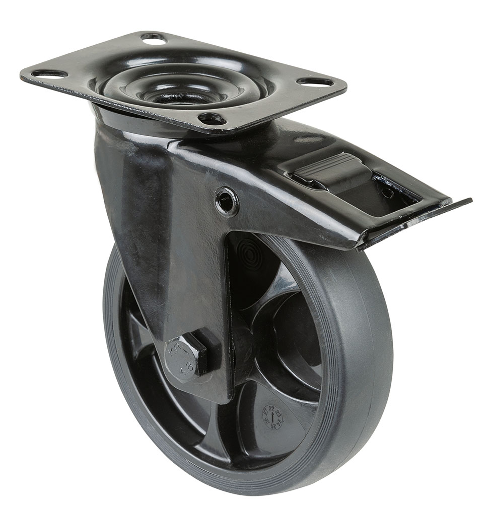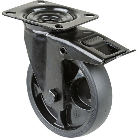 Transportní kolo v otočné vidlici s brzdou s uchycením na plotnu na čtyři šrouby