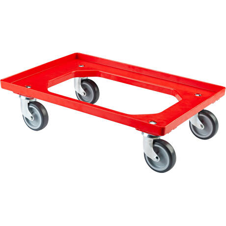 Trasnportní vozík pro přepravky nebo krabice o rozměru 60x40 cm, opatřen otočnými kolečky s běhounem ze šedé neznačkující termoplastické pryže.